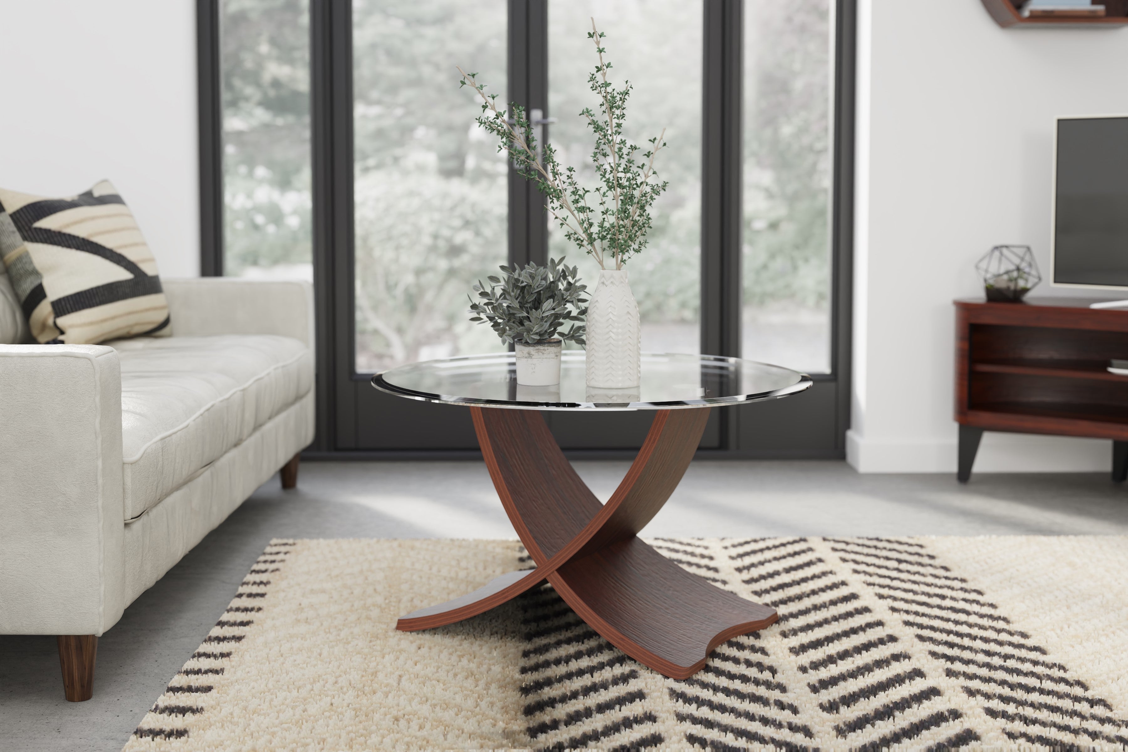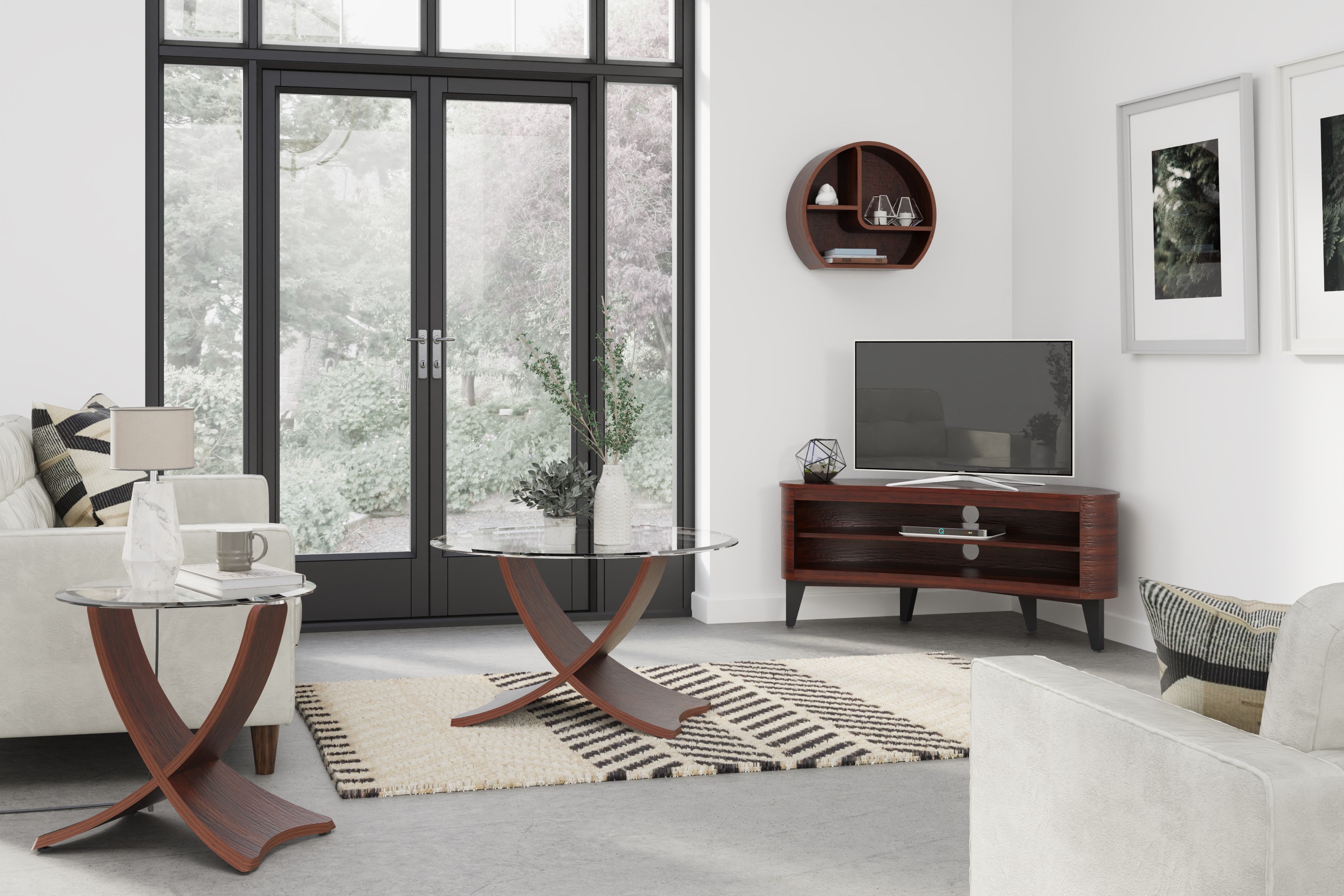 • Features: Beautiful Curve Design, Real Walnut Veneer, Toughened Glass