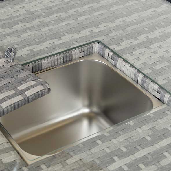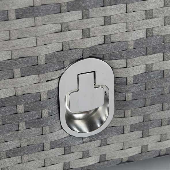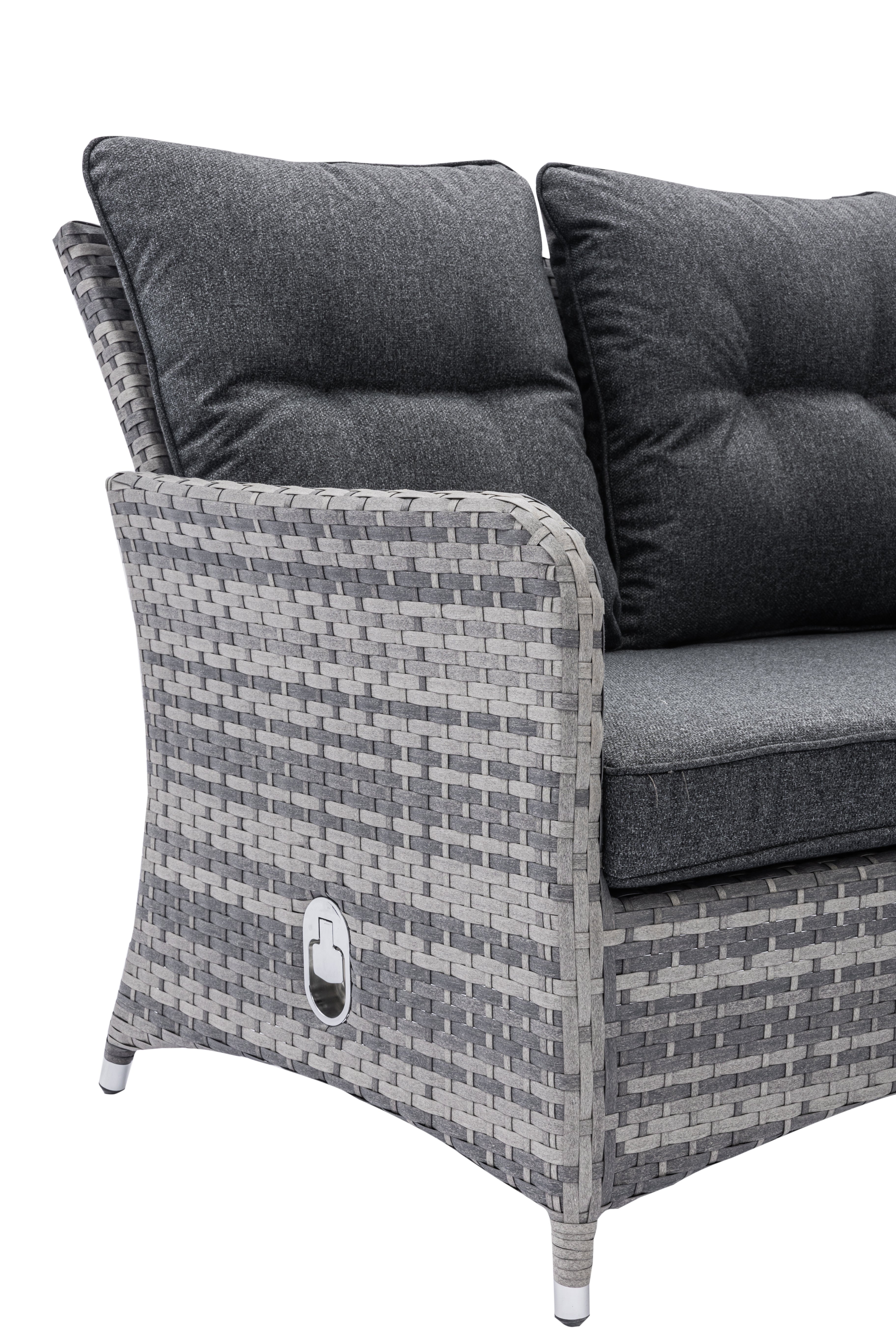 A stunning full round weave on the top of the arm gives a great-looking contrast and is complimented with brushed aluminum-styled feet. The grey cushions are premium quality, super thick, and will make sure you spend many a lazy weekend not wanting to leave your garden. The rising table also has a contrasting weave around the top and bottom and a full weave underneath the glass. This gorgeous sofa set is made in a multi-grey 20mm wide.