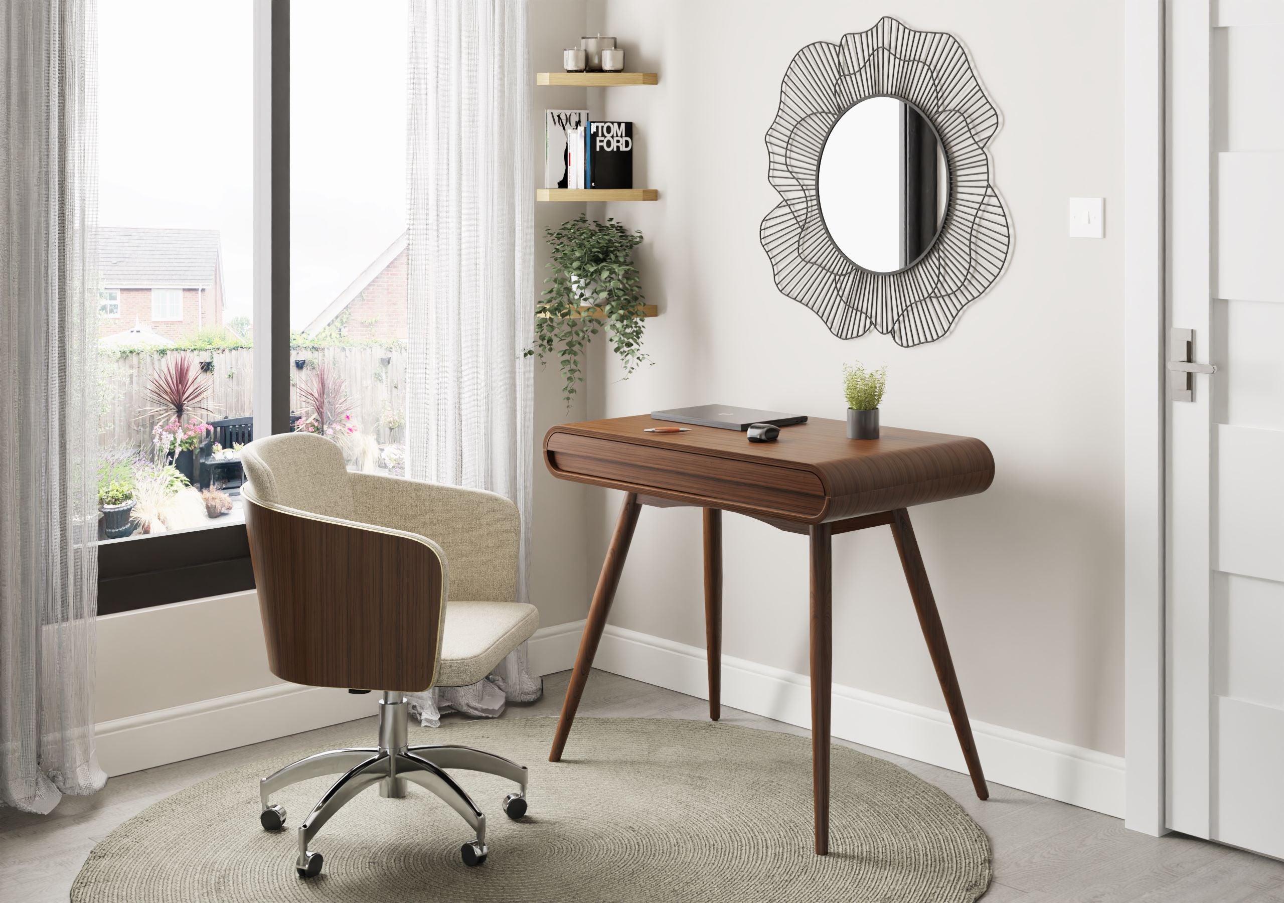 Discover a compact and stylish solution for your workspace needs, offered in elegant Oak or Walnut veneer finishes. Meticulously crafted to enhance any home office, this piece features a spacious drawer for ample storage and a sleek bentwood design that brings a touch of sophistication to any room.