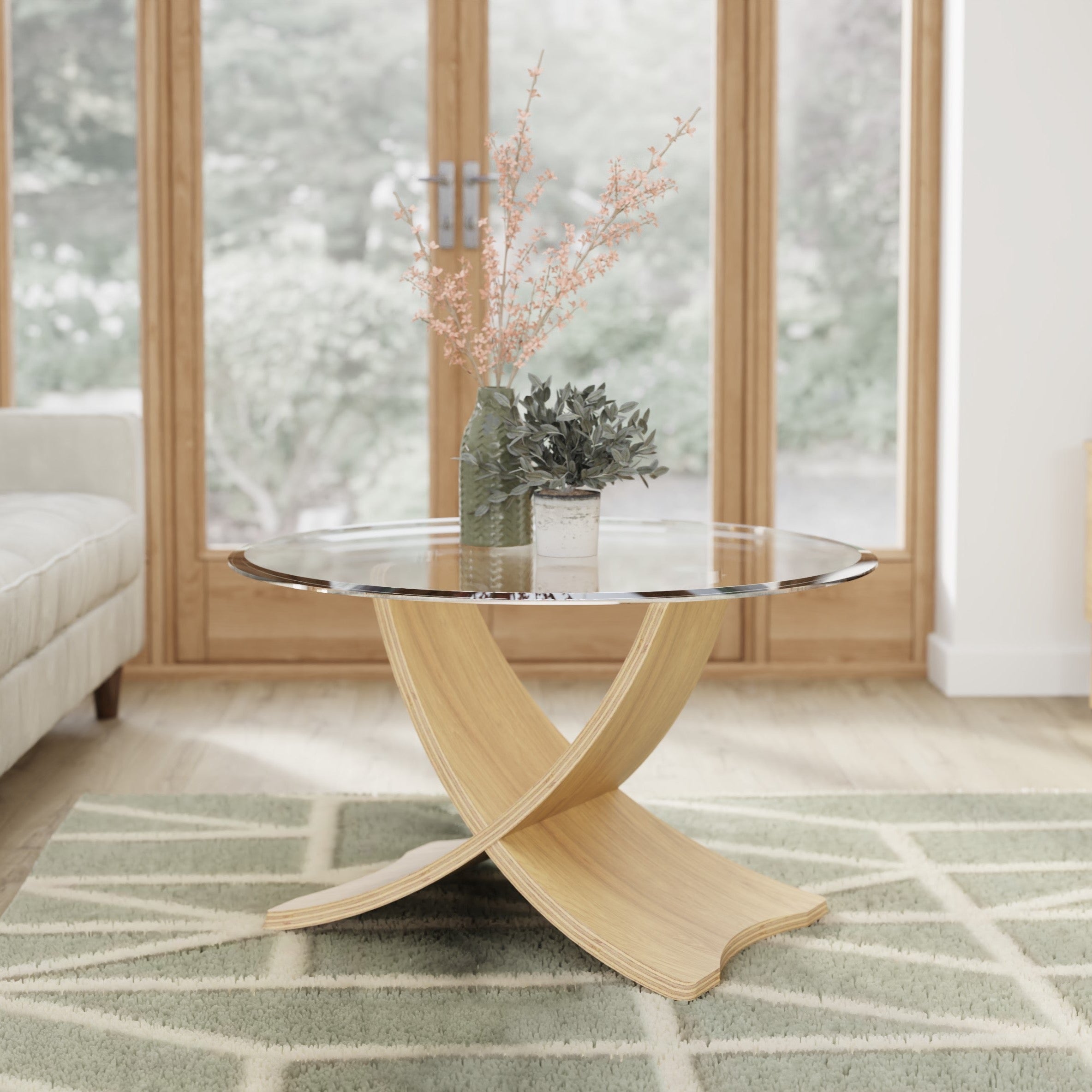 The JF308 Siena Round Glass Coffee Table is both stylish and sophisticated making it the ideal addition to any home. The clear toughened glass top has a bevelled edge and sits neatly on the sweeping oak veneered legs. The contrast between the contemporary clear glass, classic oak legs and modern chrome discs makes for a truly amazing finish. This product is ideally purchased with the matching JF309 Siena Lamp Table.
