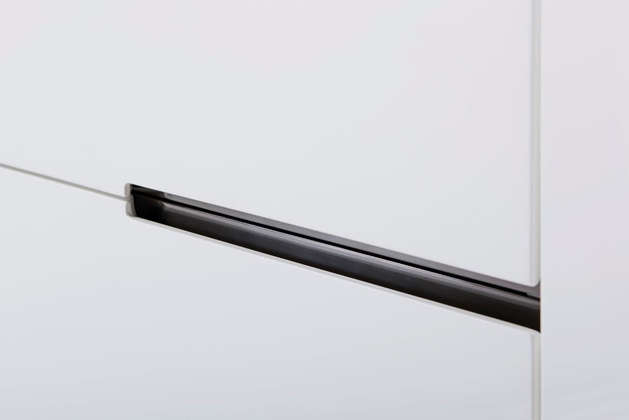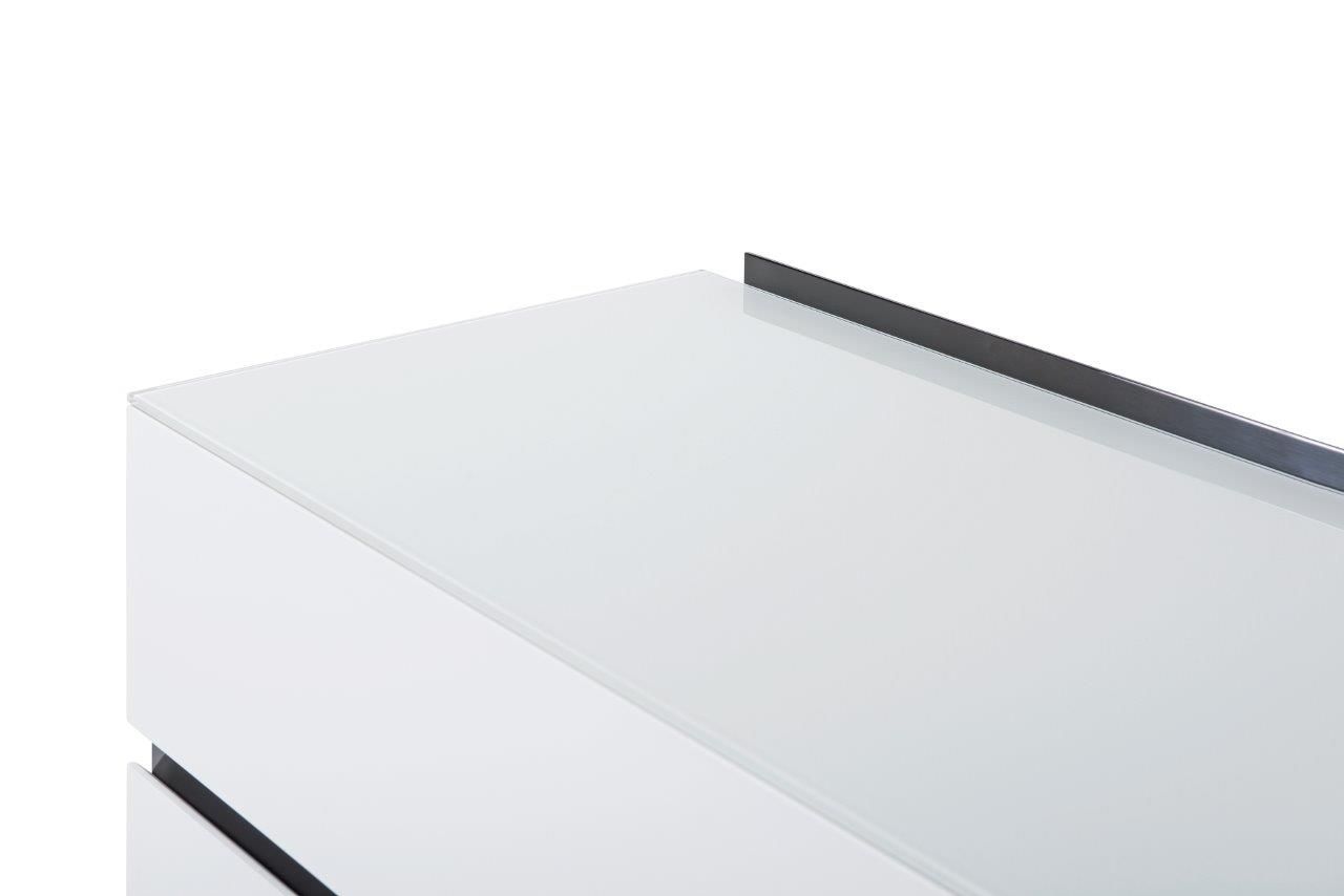 A door & drawer combination sideboard in white with dark chrome frame and accents