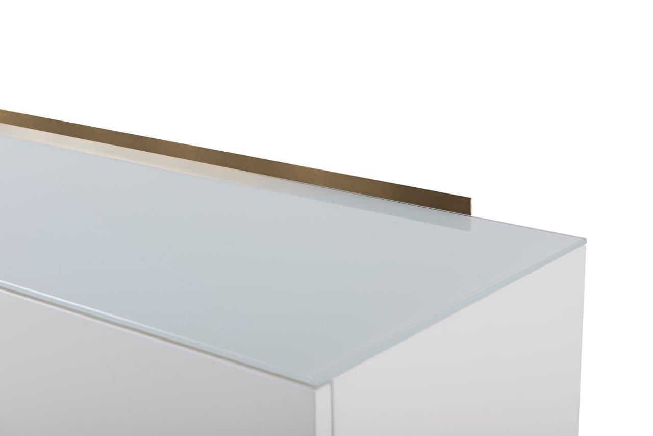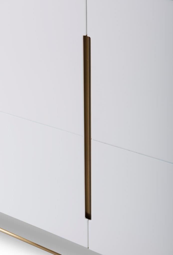 A four door high sideboard in white with brass frame and accents