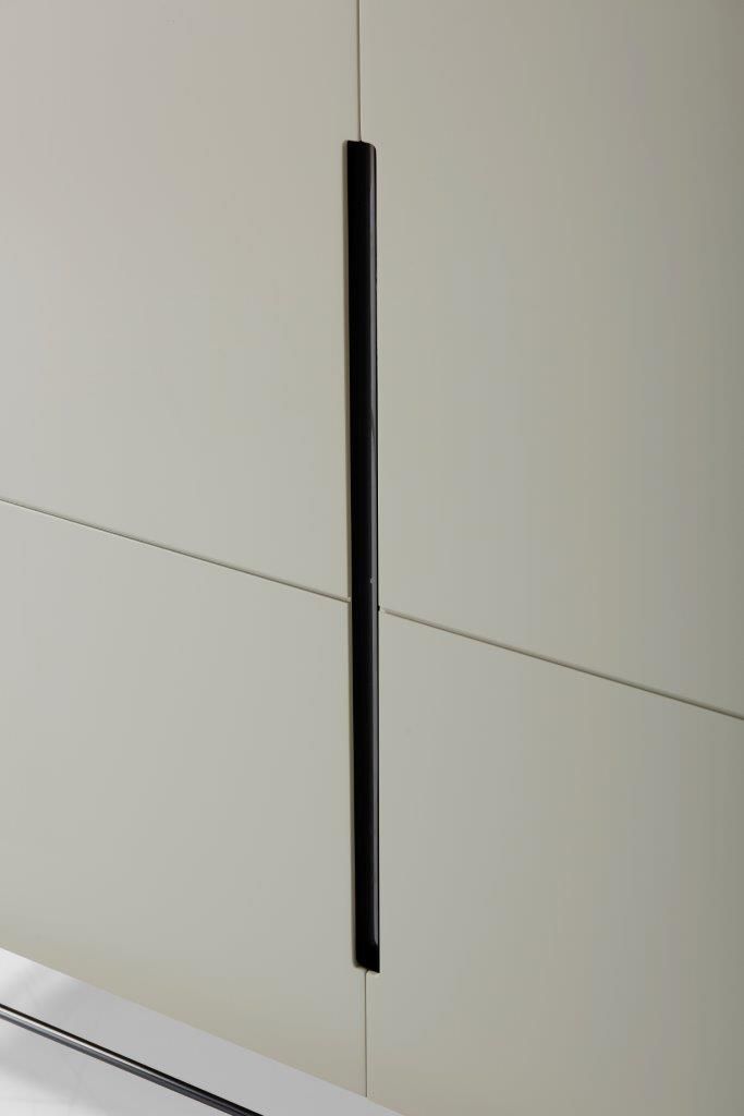 A two door high sideboard in grey with dark chrome frame and accents