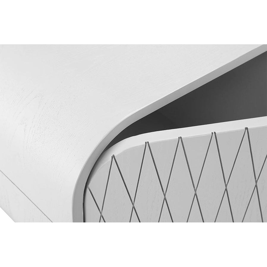 On Trend Grey Mist Finish - Hidden Storage Space - Lattice Design Doors - Unique Curved Design - Adjustable Feet - Cable Management
